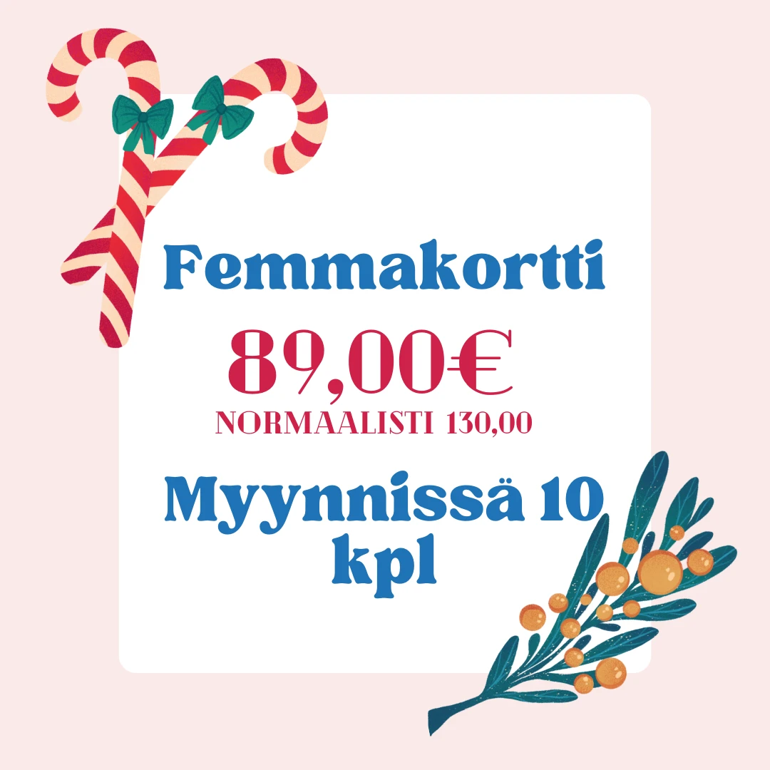 Femma-kortti joulupakettiin. femma-kortti sisältää 5 kappaletta päivälippuja. Femmakortti-kortti ei ole henkilökohtainen, mutta päiväkortteja ei voi siirtää uselalle eri kortille.